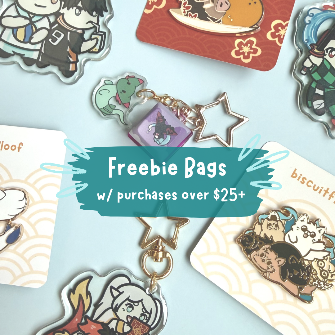 A special freebie bag included with orders over $25+ of a mystery pick of pins, keycaps, and/or keychains! Available until April 27th or while supplies last. Freebies will automatically be packed with orders placed by April 27th