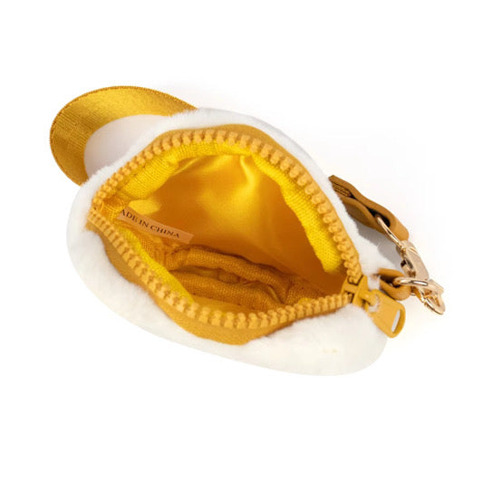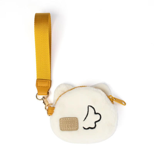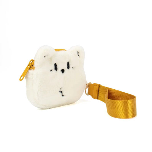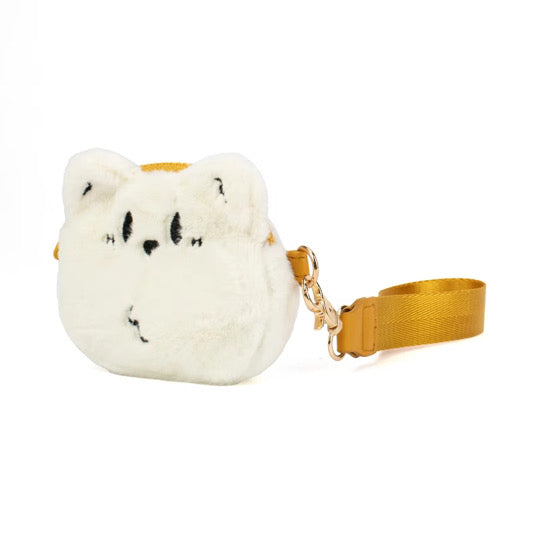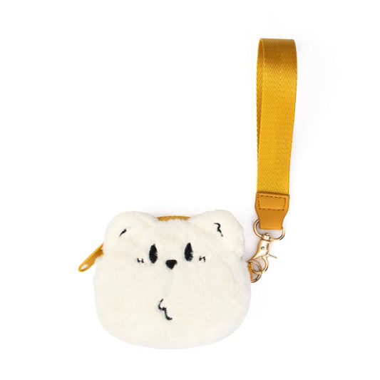 A fluffy little pouch to hold your coins, bills, and credit cards! Features fully embroidered face and tail details, a pu leather branding patch and satin lining! Comes with an orange lanyard.
